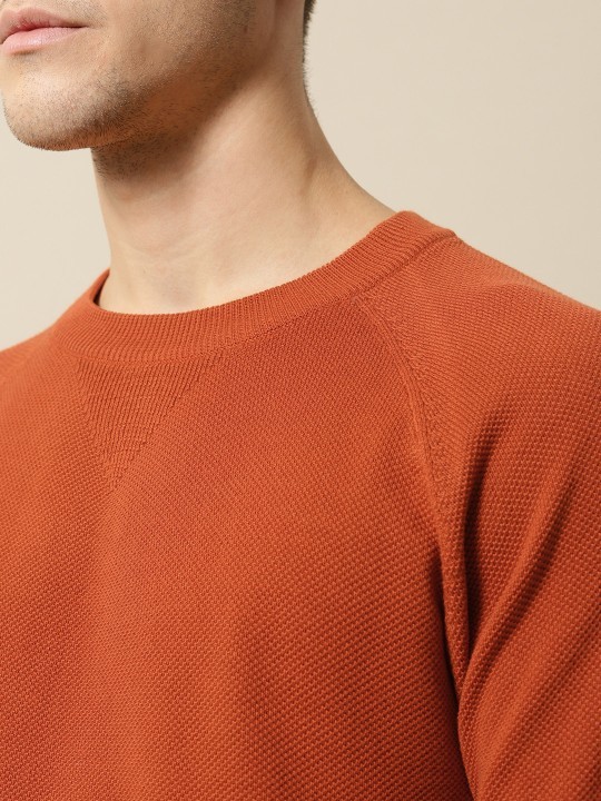 Rust-coloured solid structured flat knit crew neck T-shirt with rib V patch, short sleeves