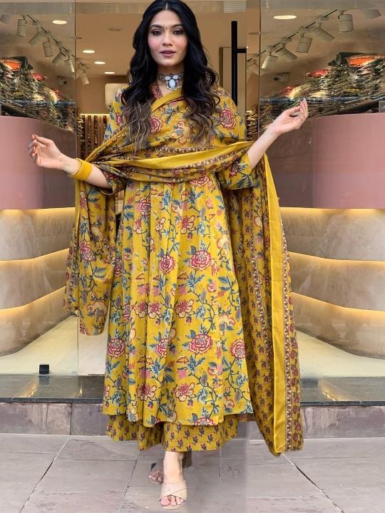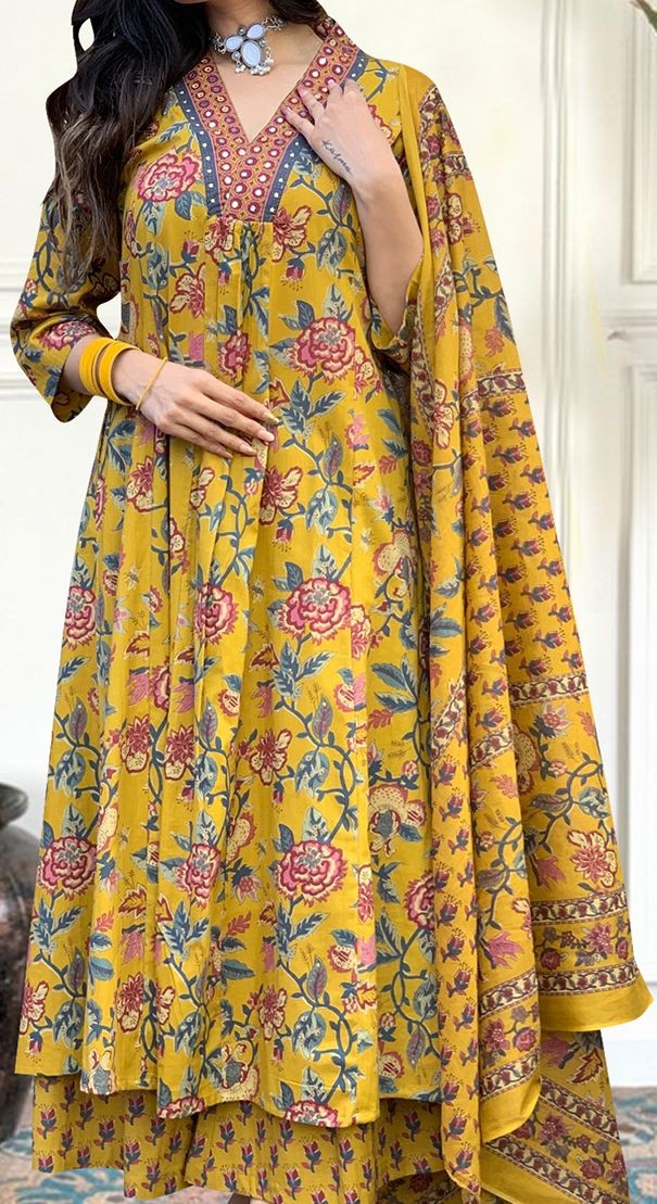 Yellow & blue printed Kurta with Palazzos & dupatta