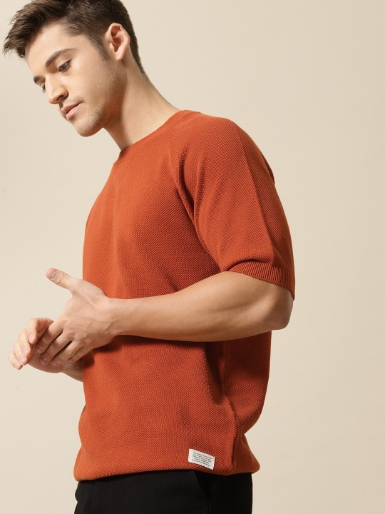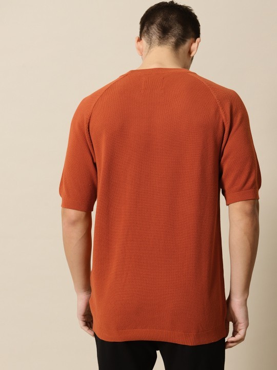 Rust-coloured solid structured flat knit crew neck T-shirt with rib V patch, short sleeves